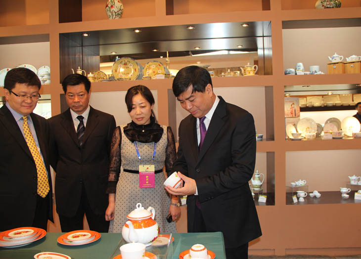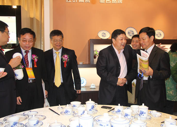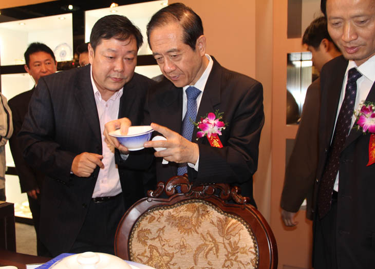 全國人大常委會副委員長韓啟德在我公司展館參觀,對我公司在全國青花玲瓏及青花日用陶瓷器形與裝飾設(shè)計大賽金獎作品《憶漢》非常感興趣