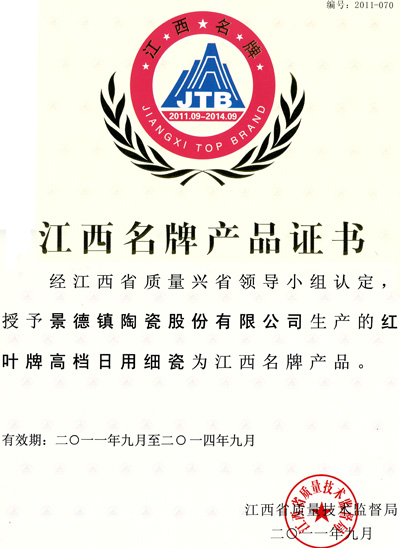2011年10月9日在南昌召開了2011年江西名牌產(chǎn)品及質(zhì)量管理先進(jìn)企業(yè)授牌大會,“紅葉”陶瓷榮獲2011年江西名牌產(chǎn)品稱號。