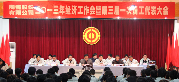 在市政協(xié)、市人大“兩會(huì)”勝利閉幕之際, 2013年1月17日下午,景德鎮(zhèn)陶瓷股份有限公司2013年經(jīng)濟(jì)工作會(huì)暨第三屆一次員工代表大會(huì)在公司五樓會(huì)議室隆重召開(kāi)。